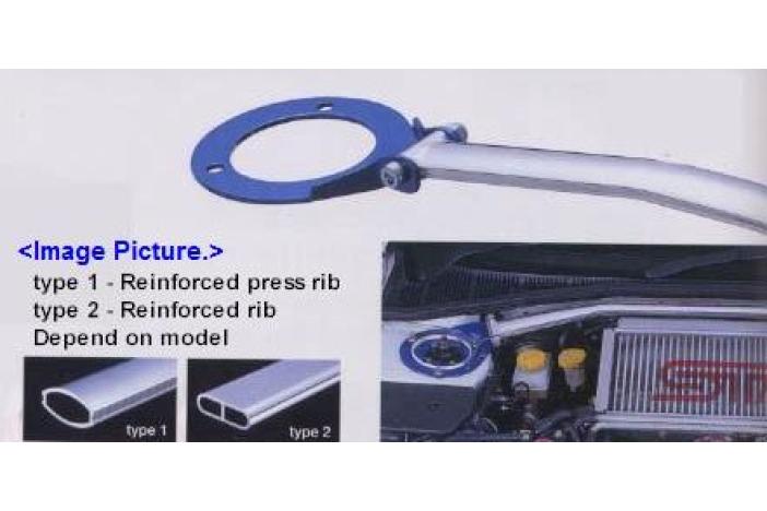 Oval shaft strut bar with Brake Cylinder Stopper. Shaft: aluminum. Section shape: oval. Plate: Steel painted in blue. Bolt-on type. **Won't fit LHD unit.
