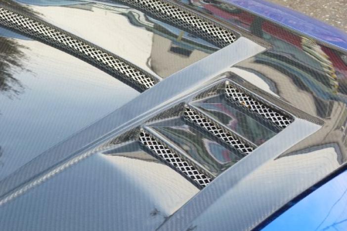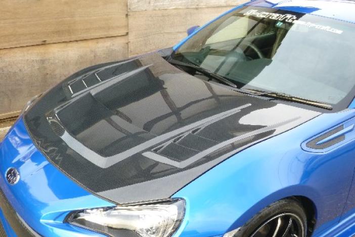 Material: Carbon (clear gel coat finish). Face is dry carbon and back is FRP. Comes with duct cover to protect from rain. It's also easy to take it off if you don't want.