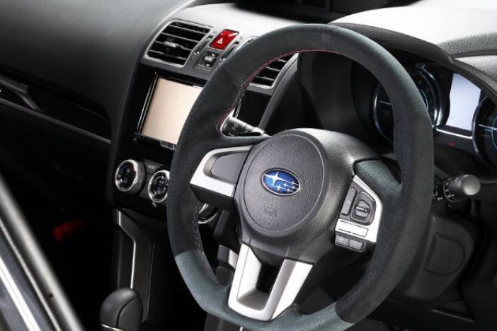 PROVA Sports steering wheel for BN/BS(A-C), SJ(D-). Cannot be equipped on the later models (D or later) of BN/BS Legacy or the earlier models (A-C) of SJ Forester. Red and blue cross stitch.