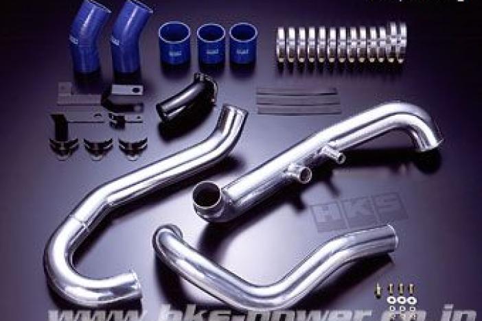 Stock plastic or rubber intercooler pipes can expand or crack under high boost levels. In addition to this, stock pipes have many bends which in some places are very tight radius which causes much resistance and pressure drop. HKS Piping kits are made of aluminum for increased durability and safety. The pipes have been redesigned to decrease the number of bends and to increase bend radius to minimize pressure loss and flow resistance.
