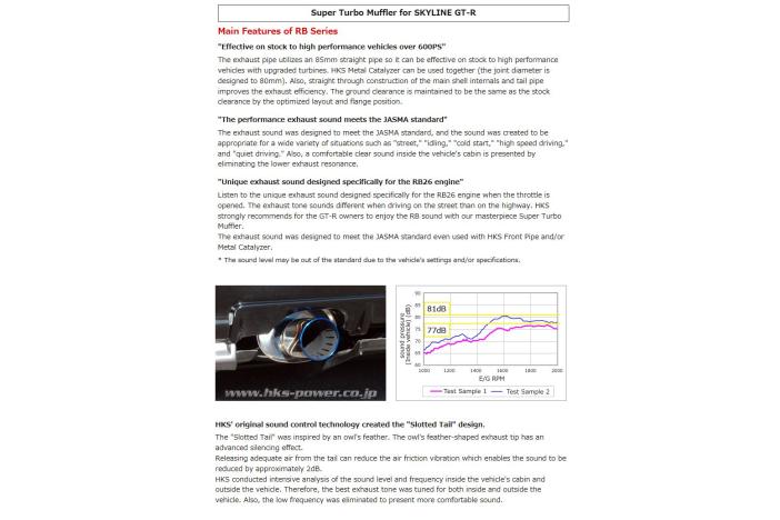 The exhaust sound was designed to meet the JASMA standard even used with HKS Front Pipe and/or Metal Catalyzer.