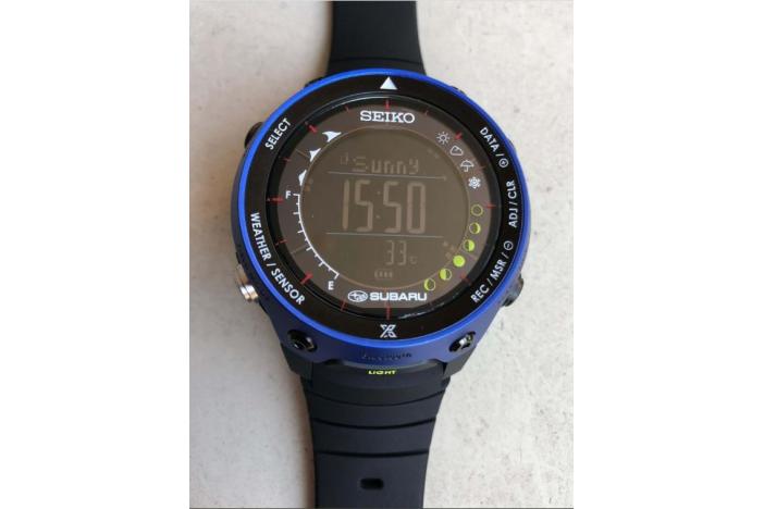 SUBARU×SEIKO collaboration watch. Limited 500. Serial number engraved on the case back. Solar. Enhanced water resistant for daily use. Material: plastic, Aluminium, stainless steel, hard rex glass, silicone rubber belt. Function: Stopwatch, Alarm, Calendar, LED light, Altitude, Atmospheric Pressure, Temperature, and derection measuring functions etc.