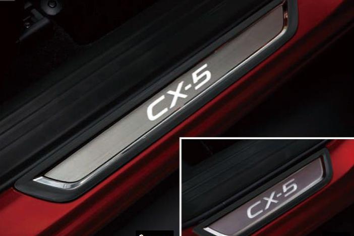 Set of 4 plates for front and rear. CX-5 logo on front plate lights up for 30 seconds when the door opens and closes (no illumination on rear plate). Requires 4 lithium batteries (CR2320).