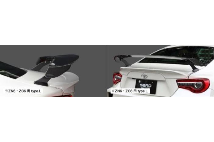 Wing: 1390mm in width. Carbon with weather-resistant urethane paint. No need to make holes for installation. Wing's angle adjustable at 4 steps. Type.L makes it possible to mount a rear spoiler such as TRD rear trunk spoiler (MS342-1800#). Please select normal (81024) or type.L (81063).
