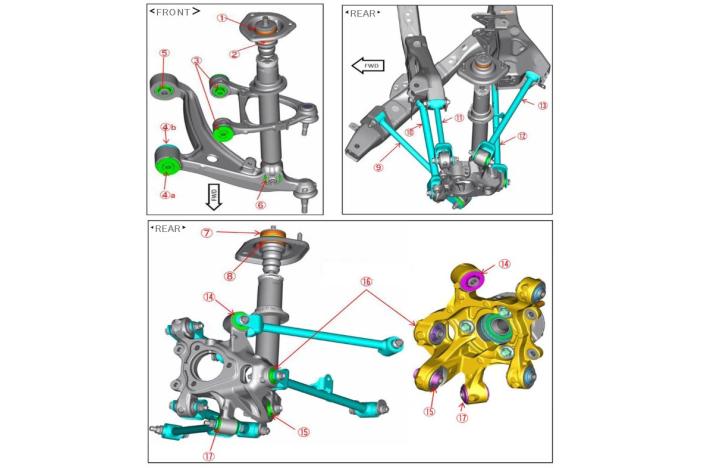 Optional product assuming combination with suspension bush (lower). By mounting the set, total tuning that suppresses the deflection of the entire suspension is completed. It realizes solid handling without ambiguity even in sports running on a closed course where high loads are continuous. Although vibration absorption is ensured compared to metal pillow balls, it should be noted that the feeling of pushing up on rough roads etc. increases in exchange for direct feeling. Set of a total of eight places: upper and lower arms on the front and rear, and lateral / leading links. Single item purchase is also possible. Rubber hardness 125-146% (compared to mass production).