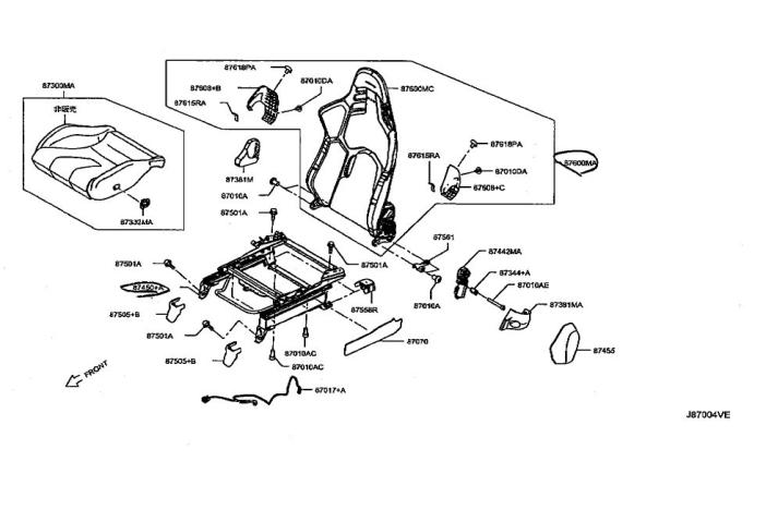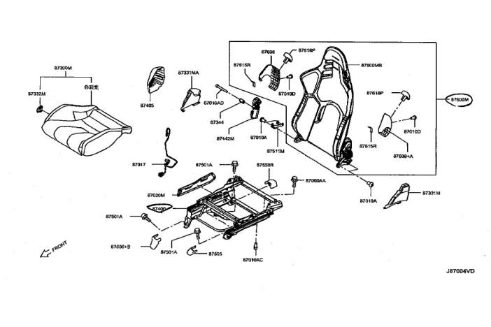 Exclusively used on GT-R NISMO 2024 model. Set of seat back, cushion and rail (87500M + 87300M + 87400 or 87600MA + 87300MA + 87450+A). Seat fitting kit is separately available (087-310-002-RH for RH or 087-310-002-LH for LH). Please select RH or LH.